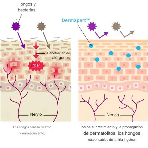 Control de humedad: DermXpert™ ayuda a controlar el exceso de humedad en el área de la ingle, creando un ambiente desfavorable para el crecimiento de hongos.